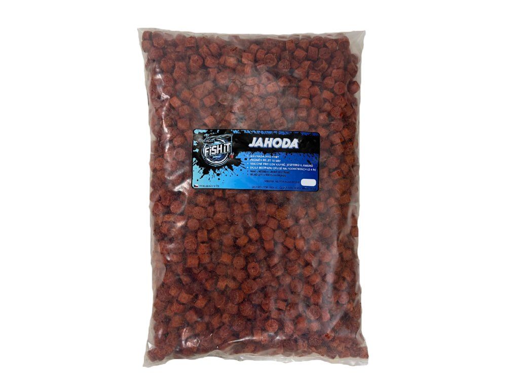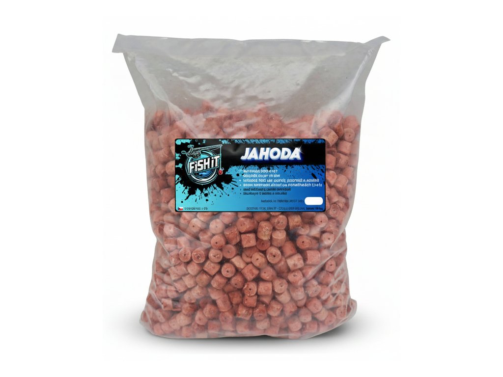 Boosterované pelety FISH IT Jahoda s dírkou jsou rybářské pelety se sladkou jahodovou příchutí, určené pro rychlé zatraktivnění krmného místa i přímé použití jako nástraha.